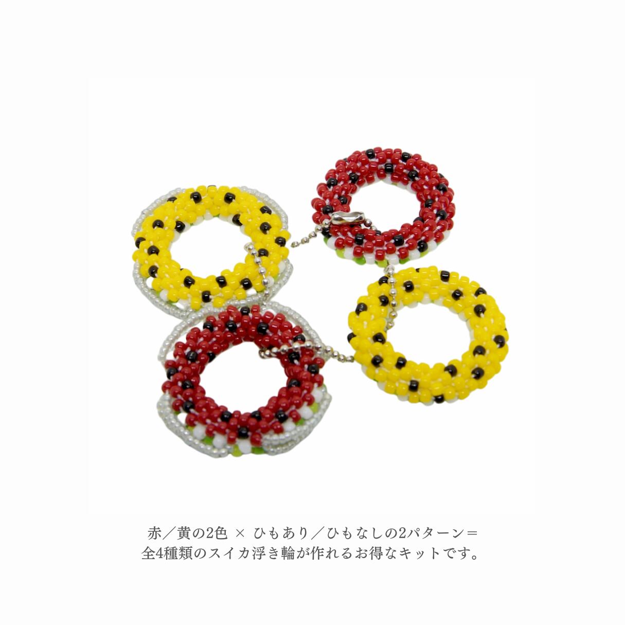 赤/黄の2色 × ひもあり/ひもなしの2パターン=全4種類のスイカ浮き輪が作れるお得なキットです。