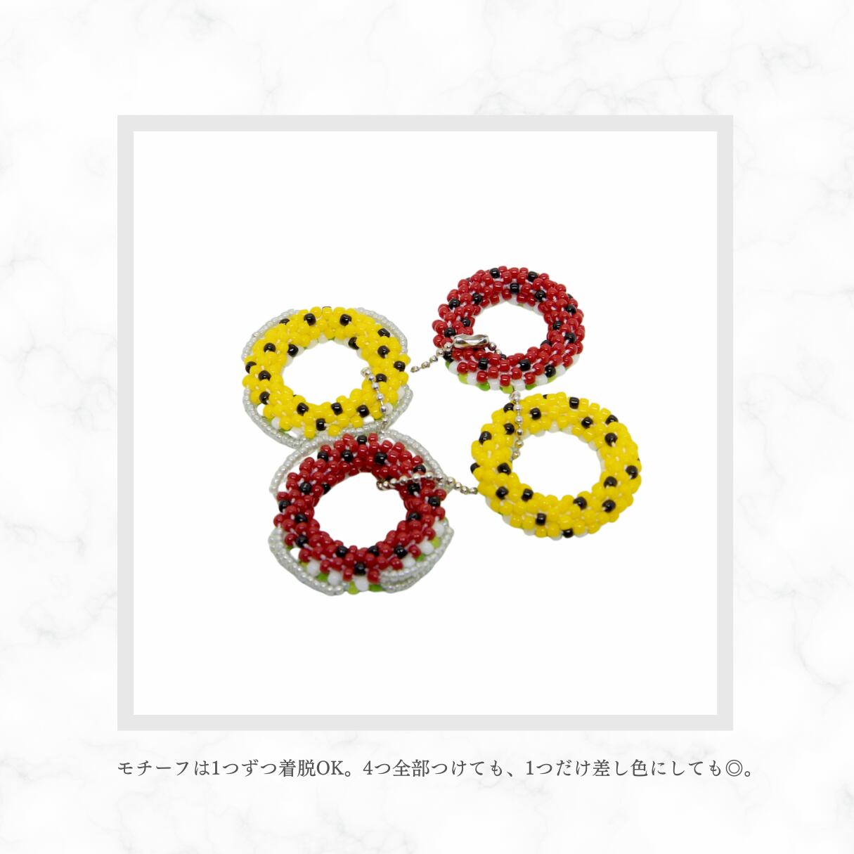 モチーフは1つずつ着脱OK。4つ全部つけても、1つだけ差し色にしても◎。