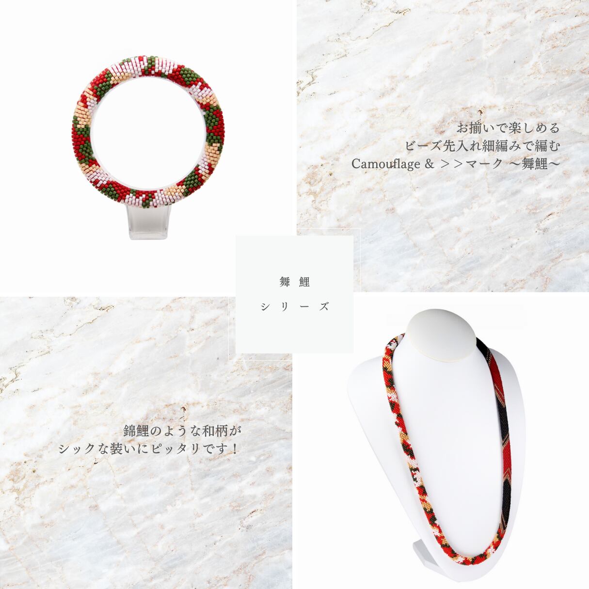 流れるようなカモフラージュ柄に、日本の美を感じる「舞う鯉」のイメージを取り入れたチューブクロッシェバングル。