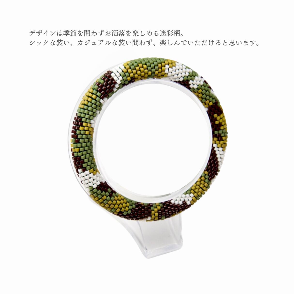 落ち着いたグリーンカラーが美しく映える、迷彩柄のチューブクロッシェバングル。
