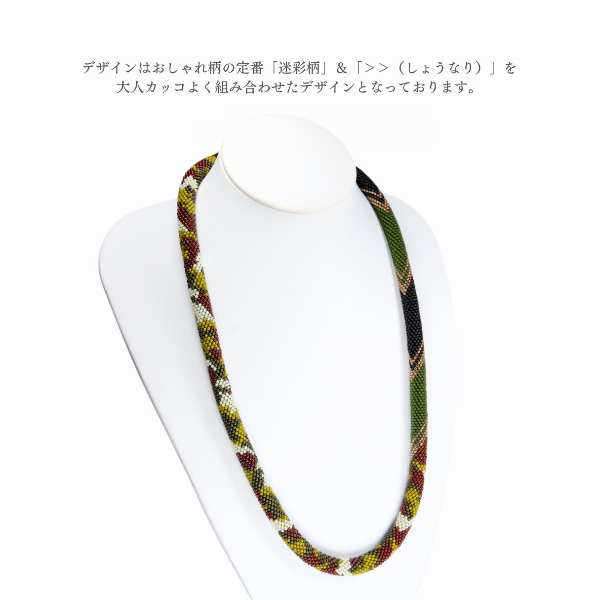 迷彩×シャープなデザインが映えるネックレスを、あなたの手で編んでみませんか?