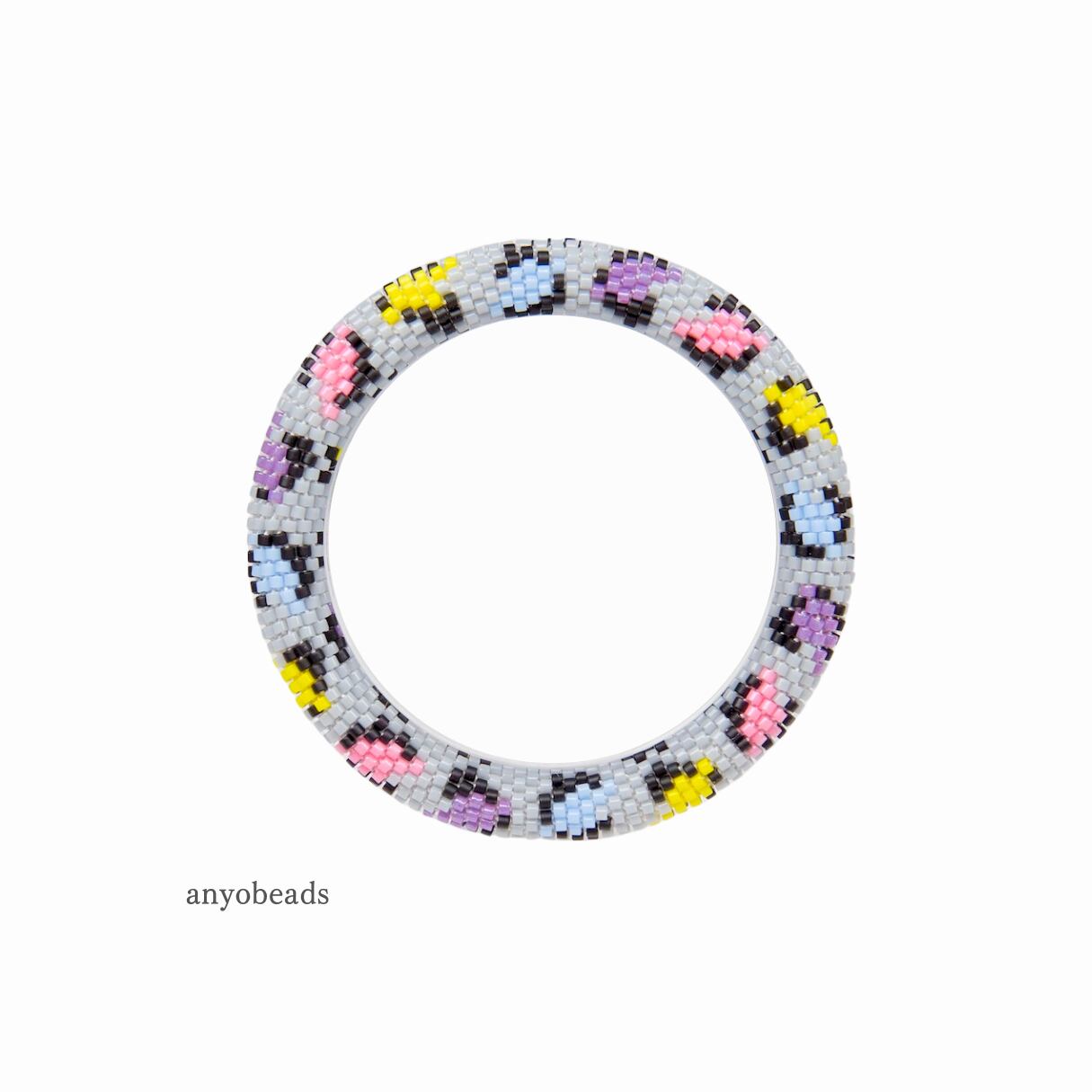 落ち着いたグレーカラーに、カラフルな4色を組み合わせた洗練されたレオパード柄のチューブクロッシェバングル。